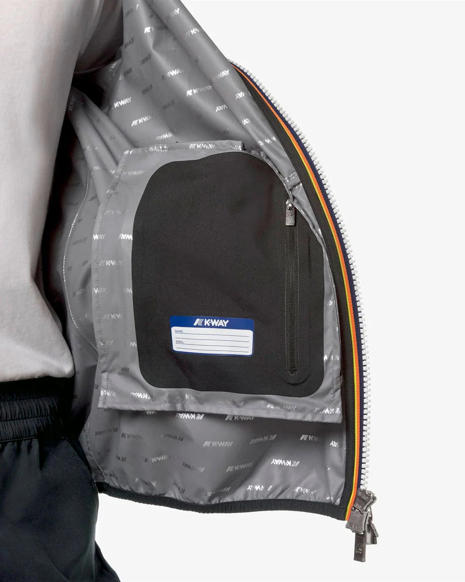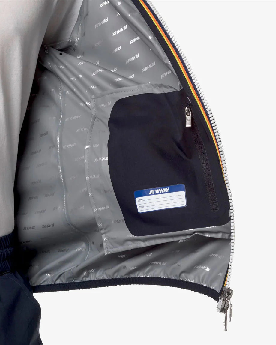 Progettata per offrire una protezione efficace dagli agenti atmosferici, la giacca è antivento e impermeabile, ideale per un utilizzo urbano e dinamico. L’interno è rifinito con una membrana isolante decorata da lettering K-Way stampato all over in elegante tonalità argento, dettaglio distintivo che unisce performance e design contemporaneo.