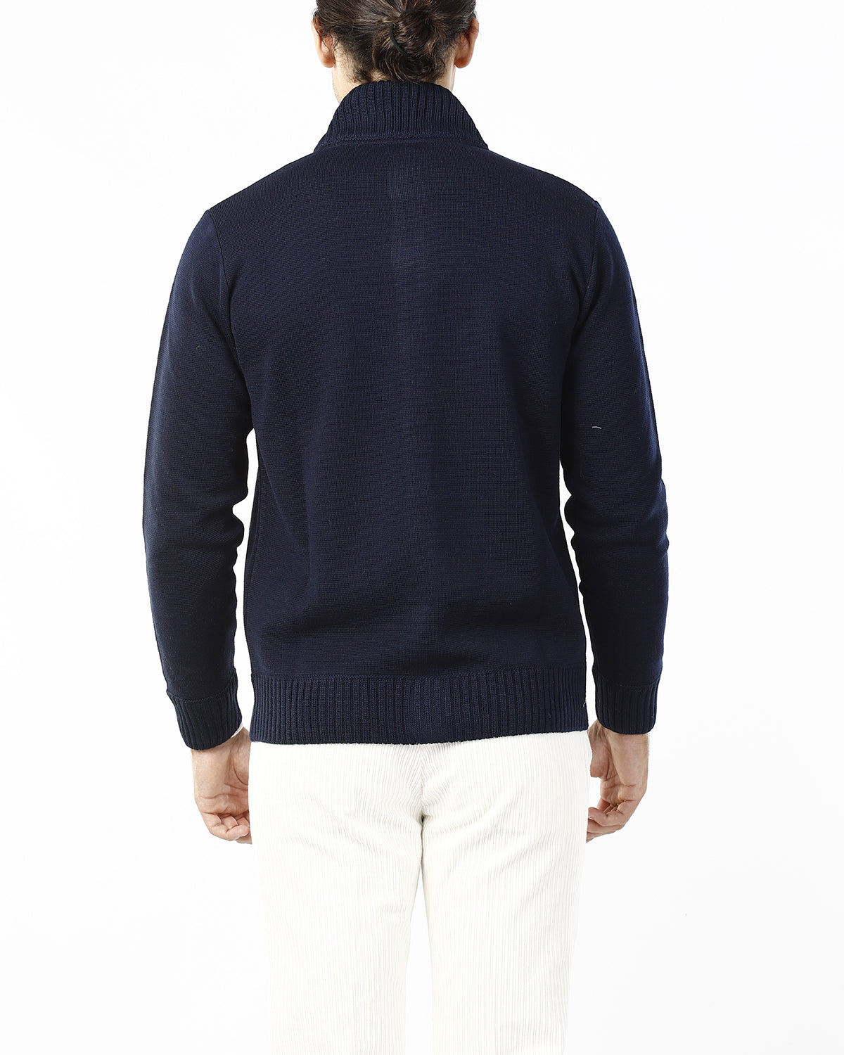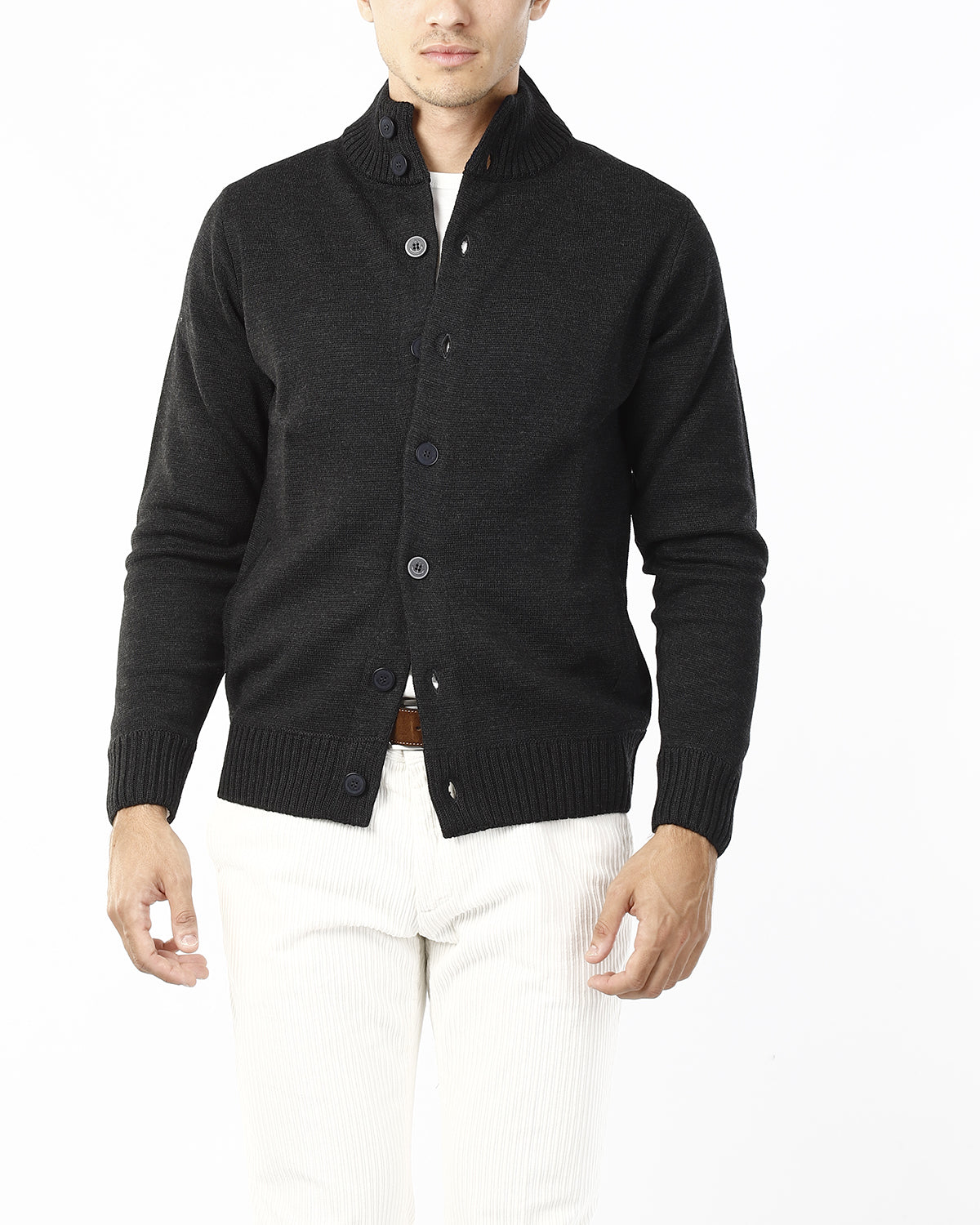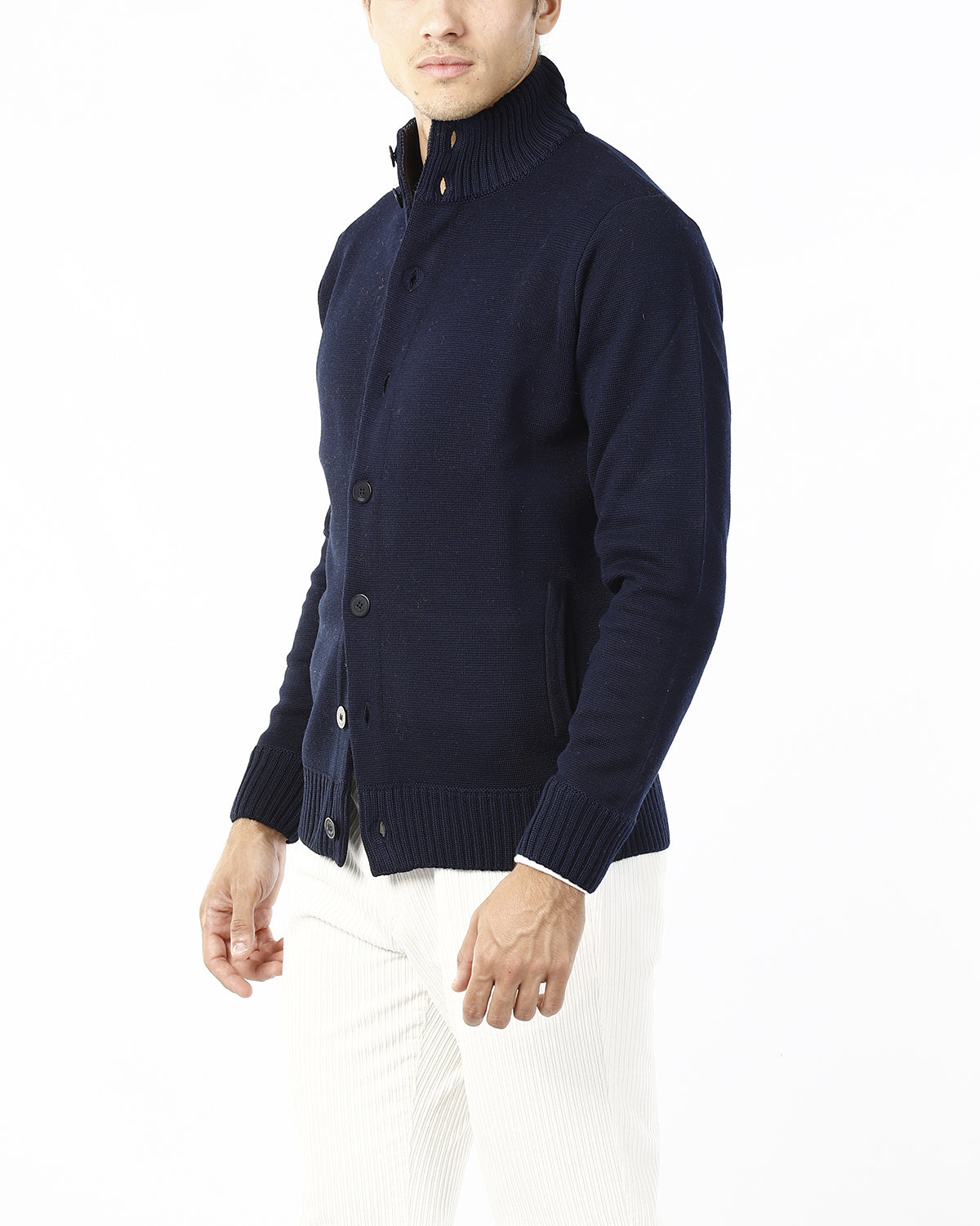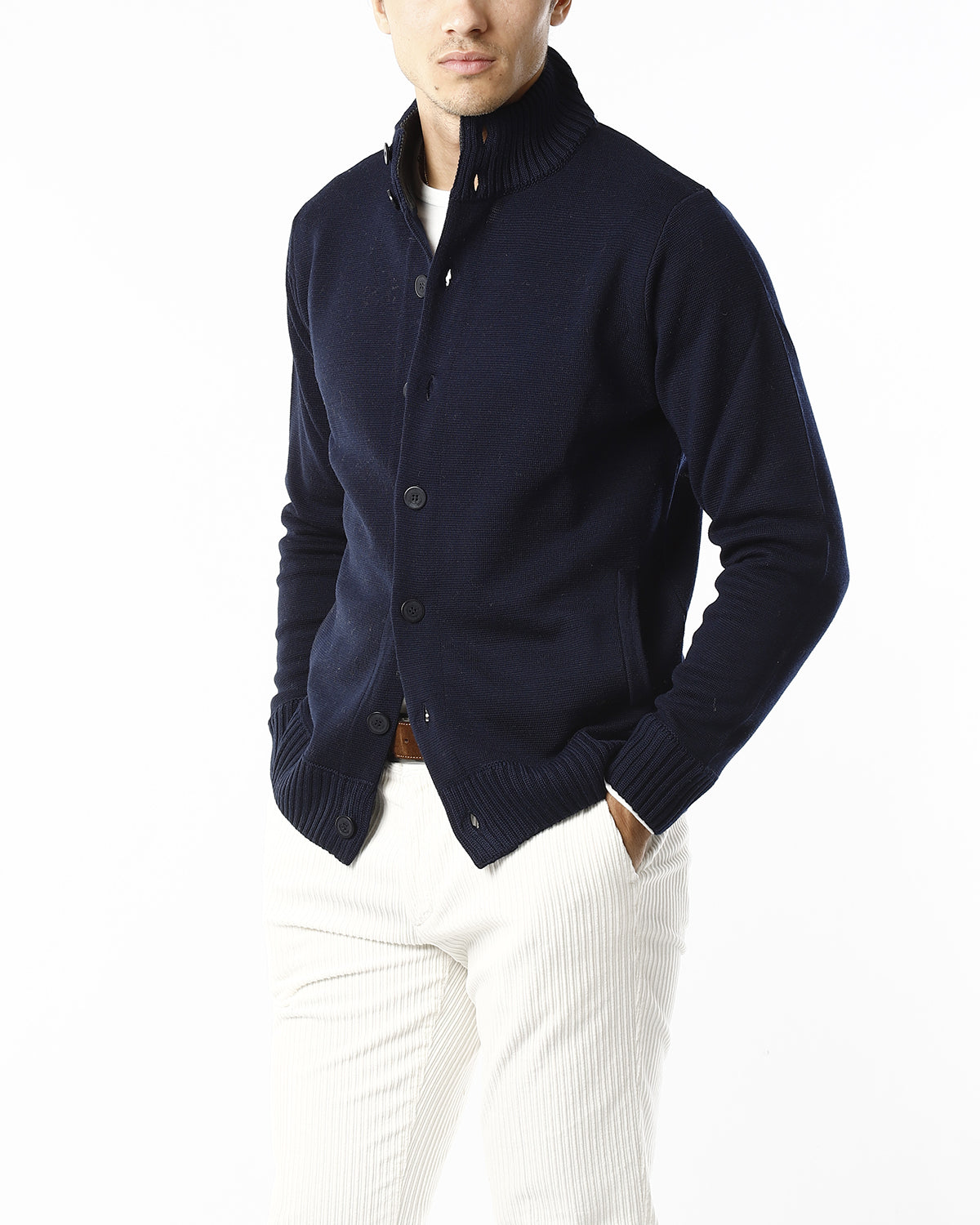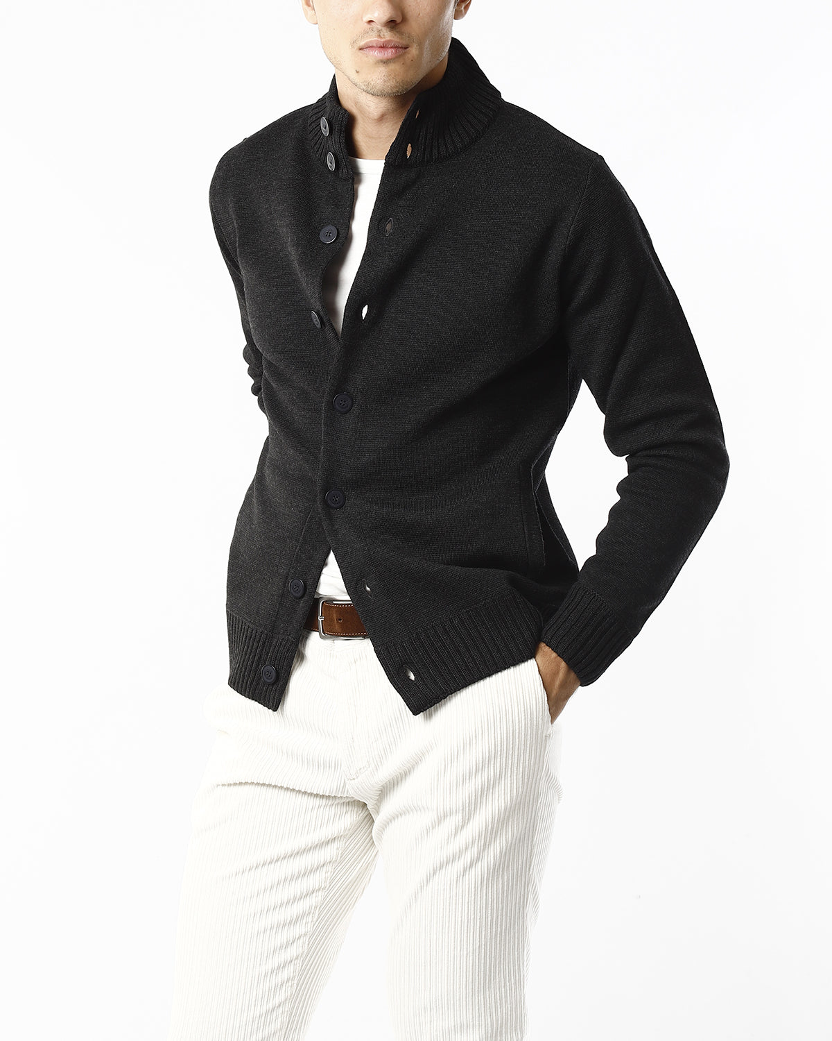 Il design si distingue per il collo alto che protegge dal freddo e per la chiusura a bottoni, caratteristica che richiama l’estetica dei bomber classici. I bordi a coste più larghe, presenti su polsini, fondo, collo, patta dei bottoni e tasche laterali, creano un piacevole contrasto con il corpo del cardigan in tinta unita, donando struttura e personalità al capo.