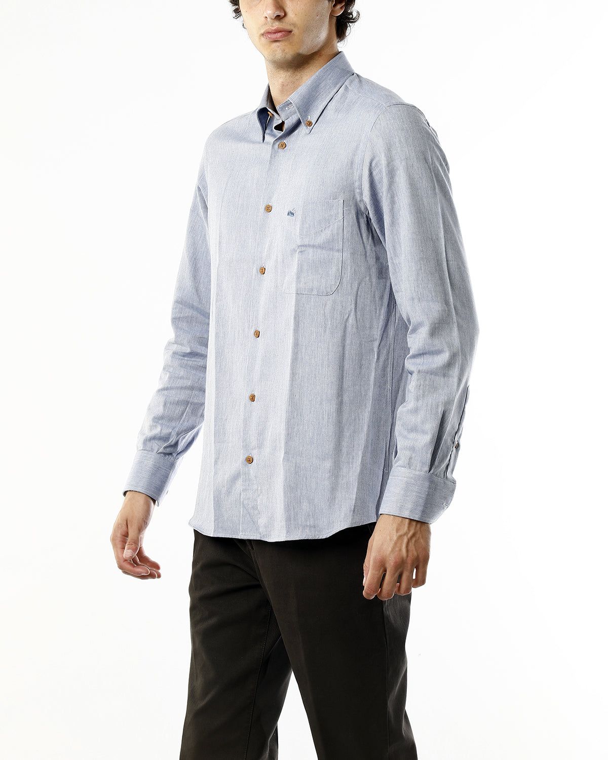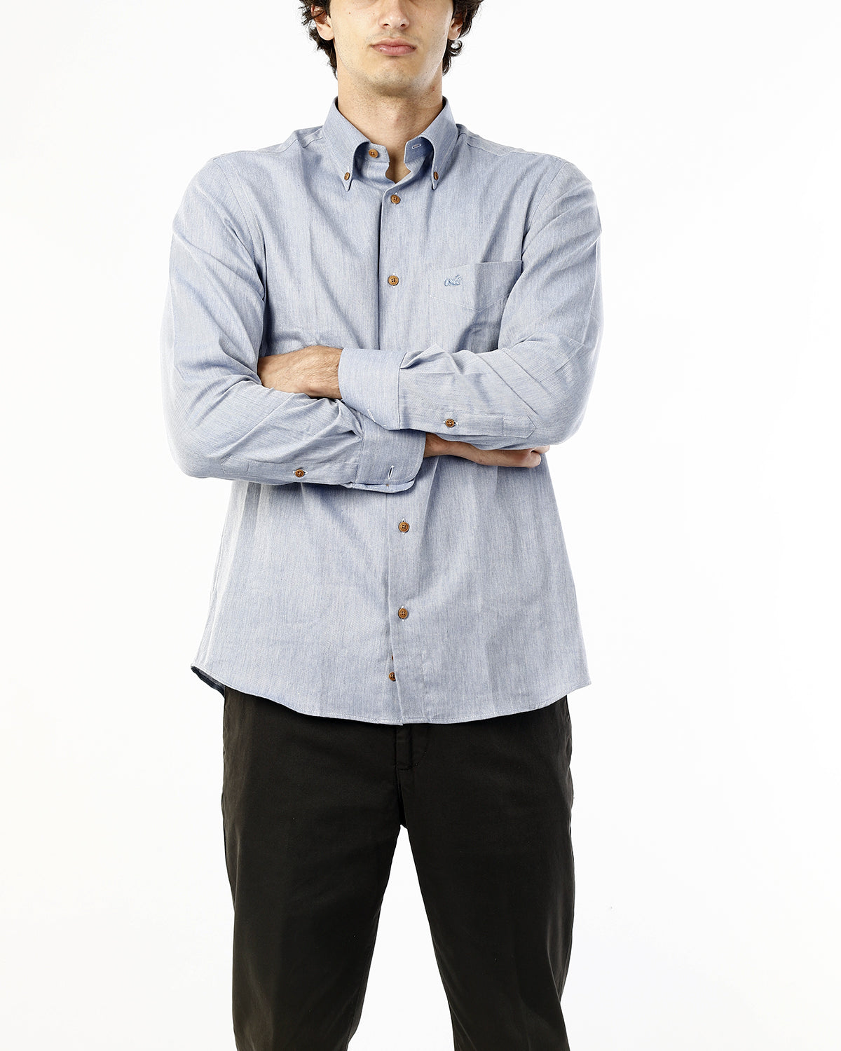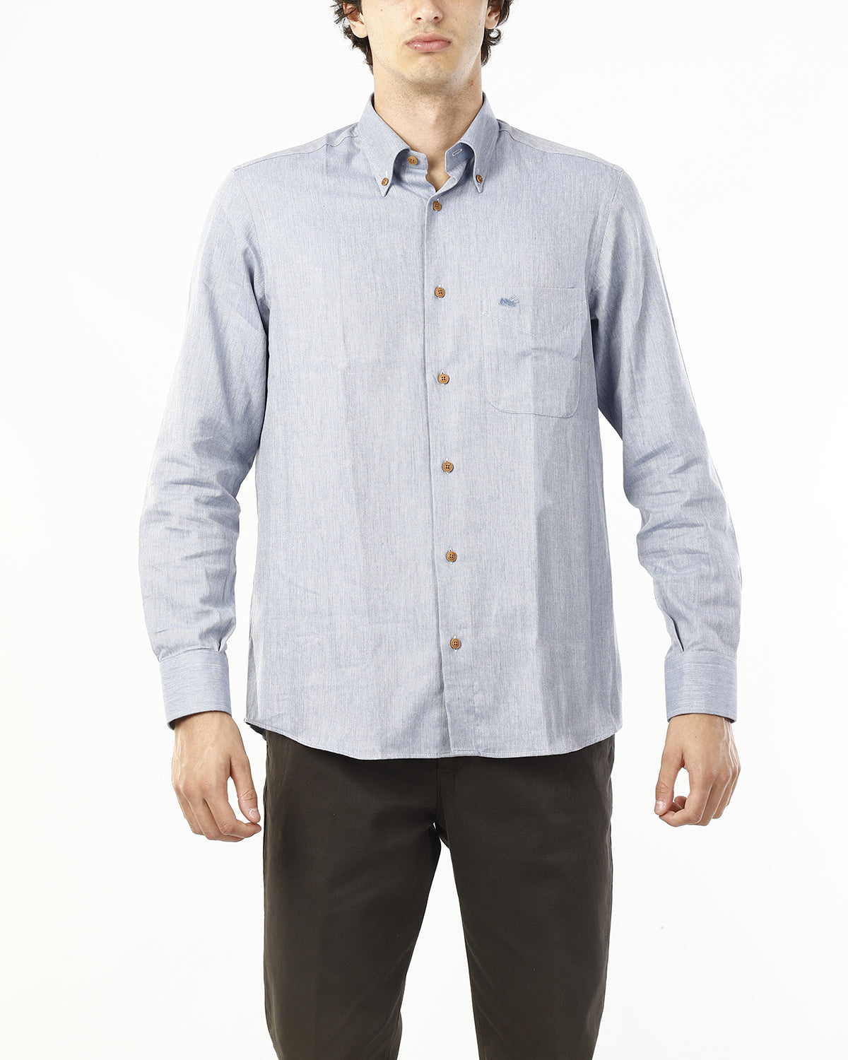 Realizzata in cotone 100% di alta qualità, questa camicia garantisce comfort, traspirabilità e una vestibilità piacevole per tutta la giornata. Il collo button-down e la chiusura con bottoni in corozo aggiungono un tocco raffinato, mentre la tinta unita azzurro effetto jeansato rende il capo estremamente versatile e facile da abbinare.