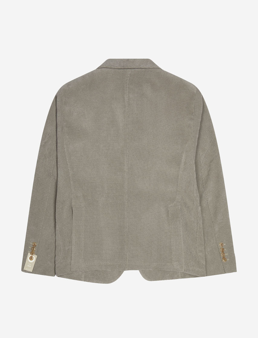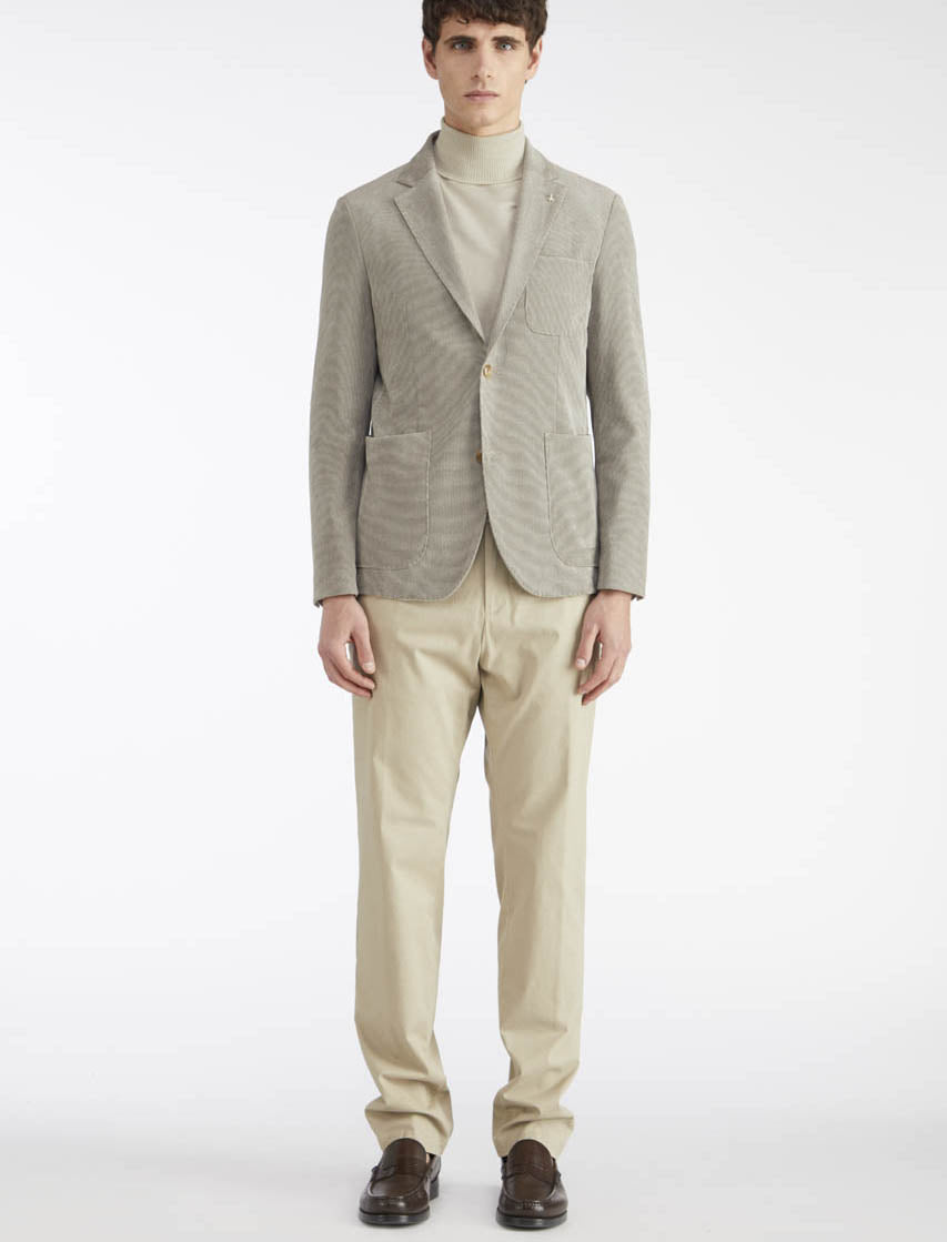 Il design presenta un collo a revers classico, chiusura frontale a due bottoni e maniche con polsini abbottonati, dettagli che richiamano la tradizione sartoriale in chiave attuale. La tasca a toppa sul petto, le tasche applicate sui fianchi e le tasche interne aggiungono praticità e versatilità.