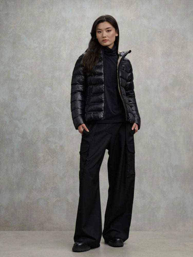 Il design è caratterizzato da un fit sfiancato che valorizza la silhouette femminile senza rinunciare alla praticità. Il cappuccio fisso regolabile con coulisse aggiunge protezione extra nelle giornate ventose o piovose, mentre la chiusura con zip nascosta e copricursore dona un look pulito ed elegante.