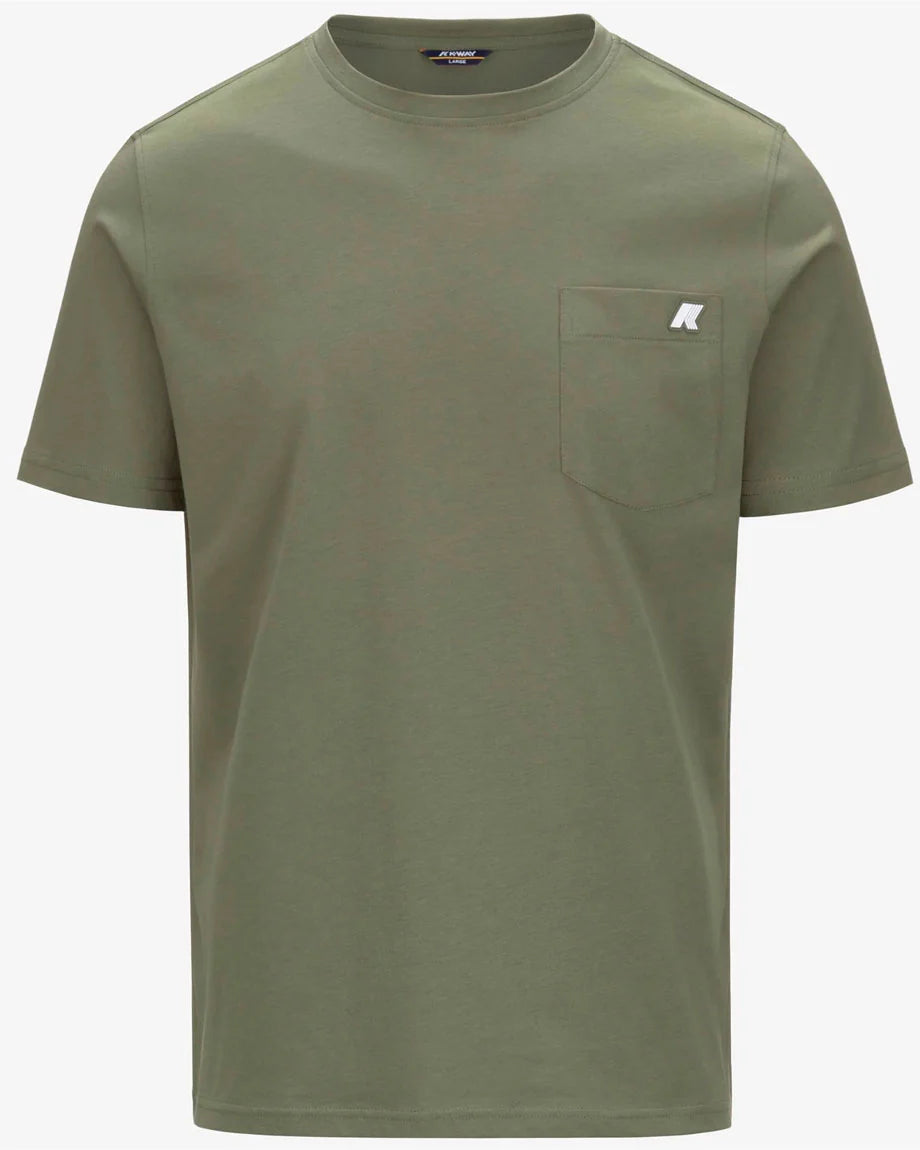 Il design presenta un girocollo classico, maniche corte e una vestibilità slim che valorizza la silhouette senza rinunciare alla comodità. Il taschino applicato sul petto aggiunge un dettaglio discreto ma distintivo, mentre il logo K-Way in silicone bianco firma il capo con eleganza minimal.
