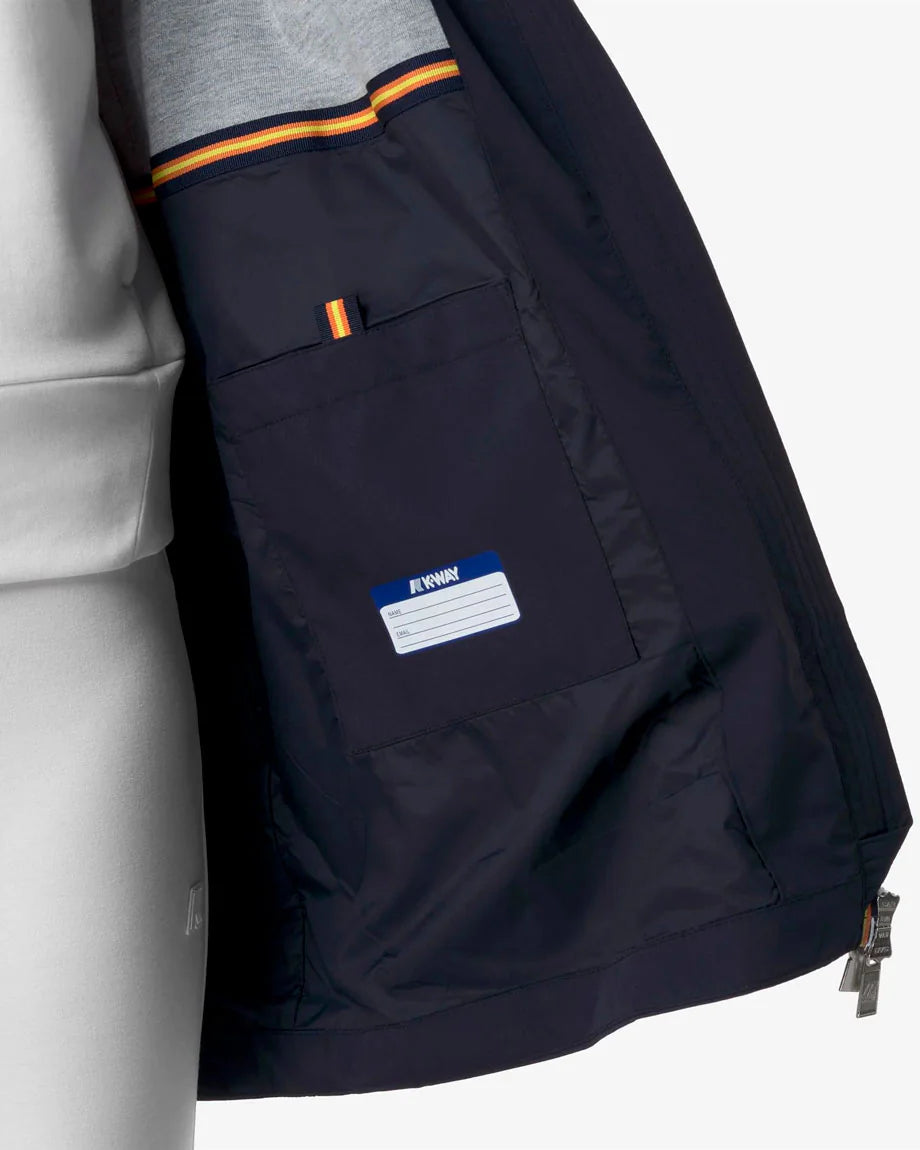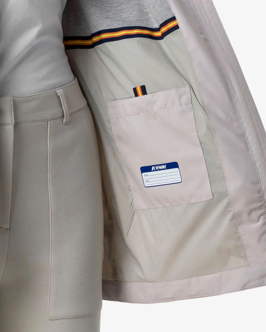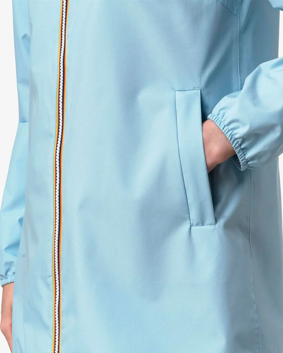Le cuciture termonastrate assicurano un’ottima tenuta contro vento e pioggia, mentre l’iconico tape multicolor K-Way posizionato al punto vita aggiunge un dettaglio distintivo che richiama l’estetica heritage del brand. Una giacca tecnica ma elegante, perfetta per chi cerca una giacca impermeabile da donna dal design pulito e contemporaneo.