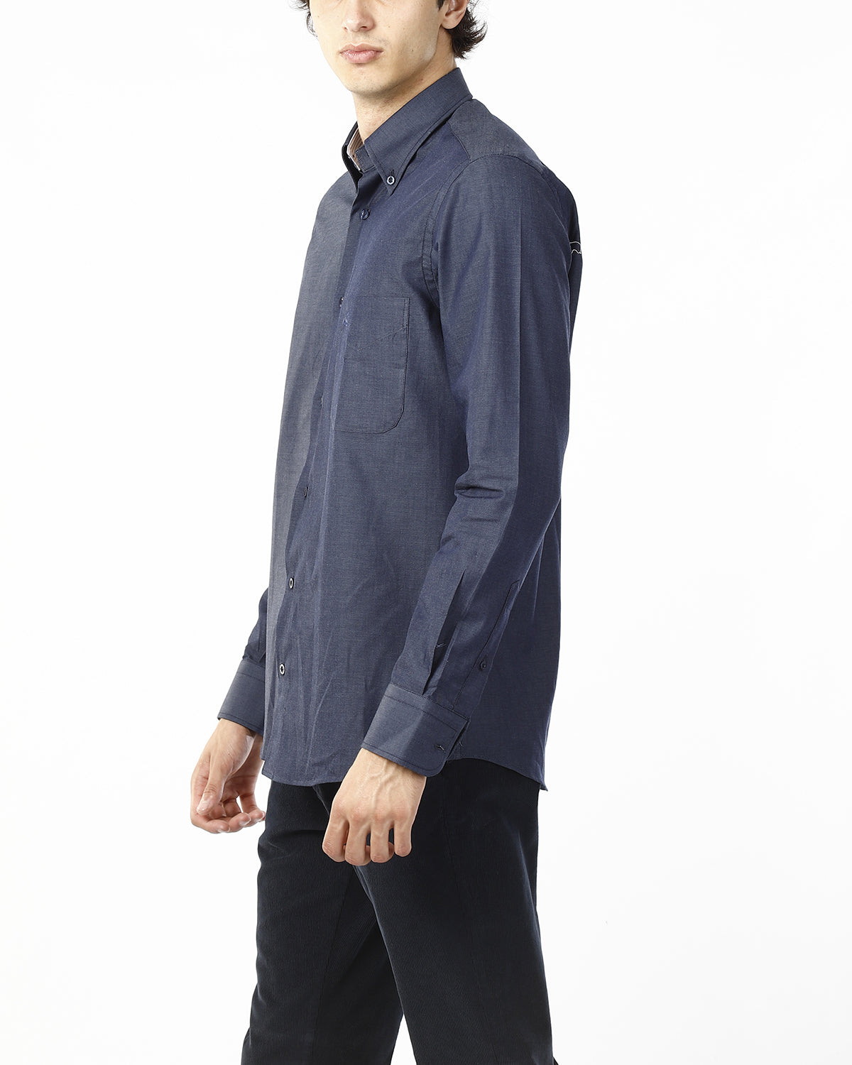 Il design presenta un collo button down ben strutturato, impreziosito da un riporto interno a righe, un dettaglio originale e discreto che aggiunge un tocco di ricercatezza al capo. La chiusura con bottoni in madreperla personalizzati tono su tono valorizza ulteriormente l’estetica pulita e sofisticata tipica di Old River.