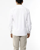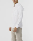 Il collo button-down dona un tocco distintivo in perfetto stile neo-british, mentre la tinta unita bianca la rende un grande classico, facile da abbinare in ogni contesto. Sul taschino frontale è ricamato il logo Old River in contrasto di colore, un dettaglio discreto ma iconico che aggiunge personalità al capo.