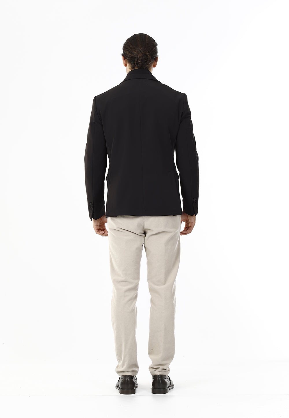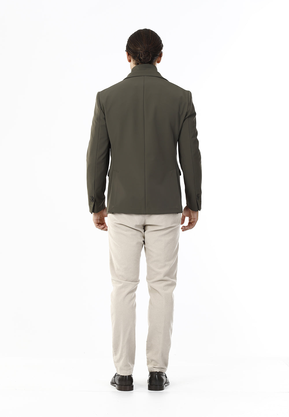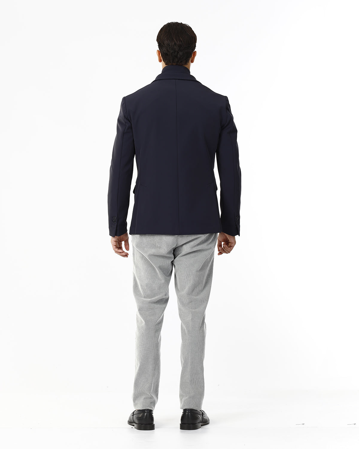 La chiusura frontale a due bottoni, le tasche laterali con pattina e il taschino sul petto riflettono la tradizione sartoriale italiana, mentre la linea pulita e moderna la rende perfetta sia per occasioni casual che per look più formali e sofisticati.